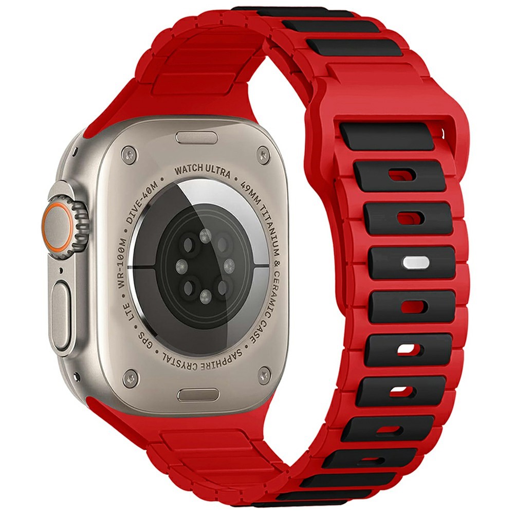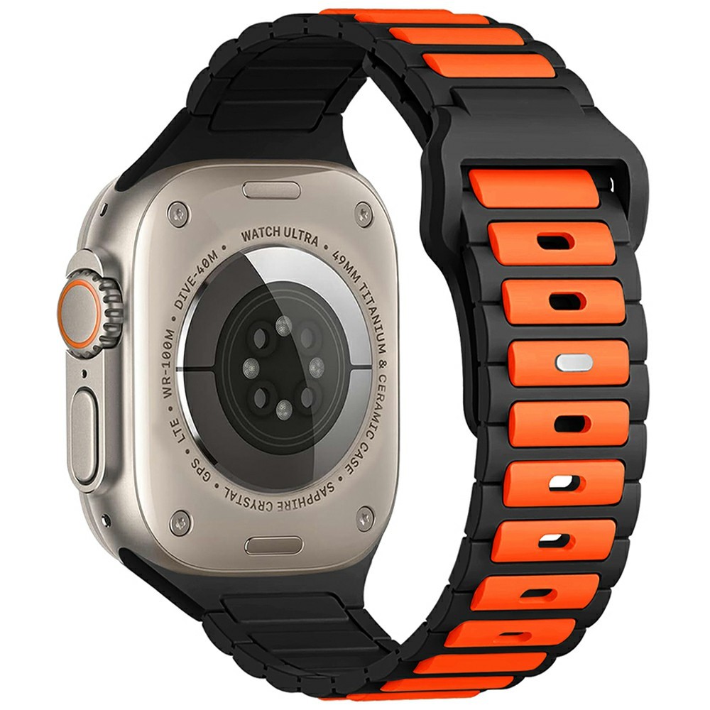 جنس بند از سیلیکون پاککنی نرم و انعطافپذیر است که روی مچ دست احساس لطیفی ایجاد میکند، در استفاده طولانیمدت باعث خستگی یا حساسیت نمیشود و در برابر عرق، رطوبت و شستوشو مقاومت بالایی دارد. طراحی چندتکه و اسپرت بند، در کنار رنگبندی متنوع و جذاب، ظاهری جسور و ماجراجویانه به اپل واچ شما میبخشد و آن را به گزینهای ایدهآل برای فعالیتهای ورزشی و استفاده روزمره تبدیل میکند.